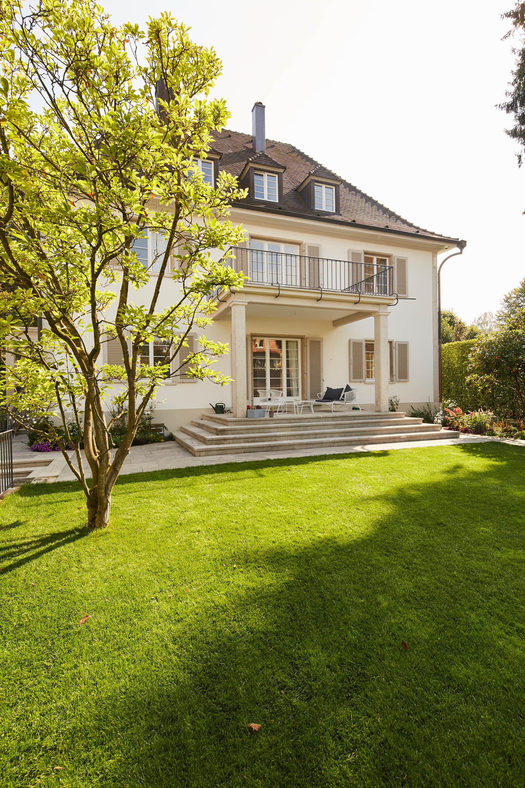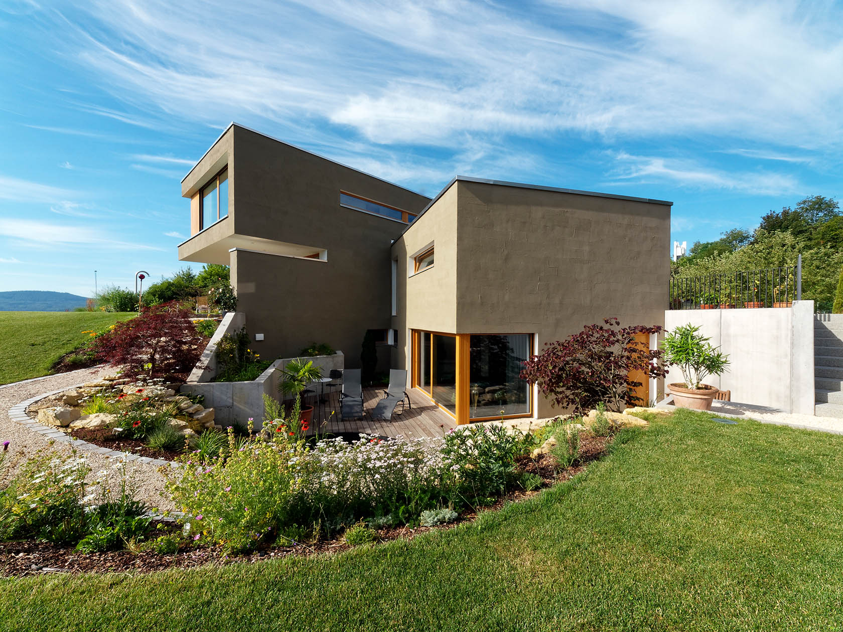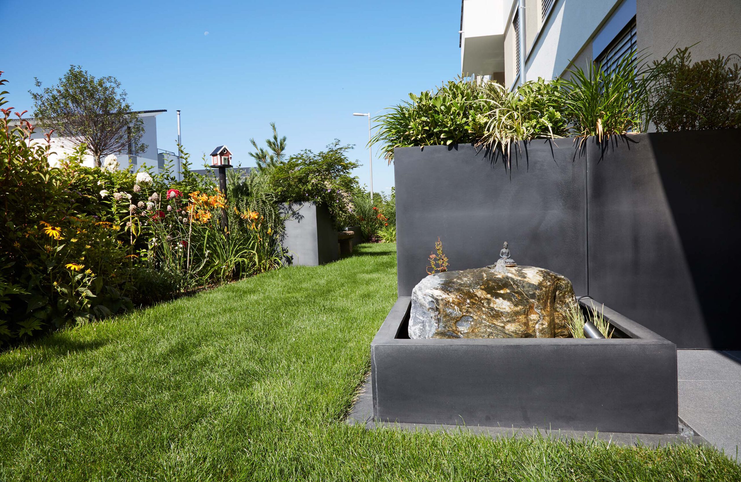 Im Jahr 1999 haben wir unser Haus gebaut, das wir sehr lieben und das 14 Jahre lang auf dem großen Grundstück stand, nicht mehr und nicht weniger. Vor 8 Jahren hat Axel Fautz und seine Firma „Fautz die Gärten“ dieses Grundstück „in die Hand genommen“ und es in eine Gartenlandschaft verwandelt, die nicht nur das Haus aufwertet, sondern uns einen neuen, wunderschönen Lebensraum gegeben hat. Verschiedene einzigartige Räume in diesem „Raum“: z.B. unsere nun zentral integrierte alte Eiche, umgeben von einer halbrunden Bank, auf der wir an heißen Tagen den kühlen Schatten genießen. Oder die große Terrasse aus mediterran anmutendem Kalkstein neben dem großzügigen Pool, die nicht nur an lauen Sommerabenden zur Happy Hour einlädt mit Blick über Freiburg, sondern auch zu sportlichem Schwimm- und Badevergnügen. Und derjenige, der nach einem langen Arbeitstag Entspannung und Ruhe sucht, findet sein Plätzchen auf der kleinen Terrasse vor einem alpinen Blockhaus mit Blick auf das Freiburger Münster, den Schauinsland, den Schönberg bis hin zum Blauen. Wir wissen nun (leider) nicht mehr, wohin wir reisen sollten, weil es nirgends so schön ist wie zuhause.